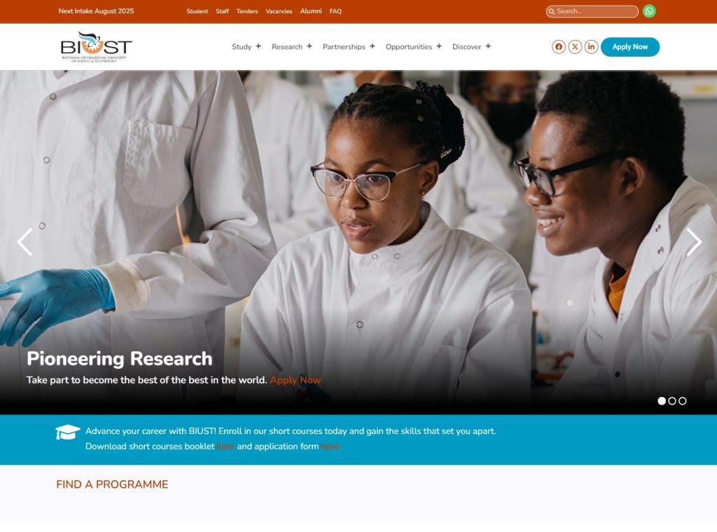 With a vision to become an internationally recognised, entrepreneurial research university, BIUST is committed to excellence in science, engineering, and technology — aligning with global best practices and fostering impactful partnerships.