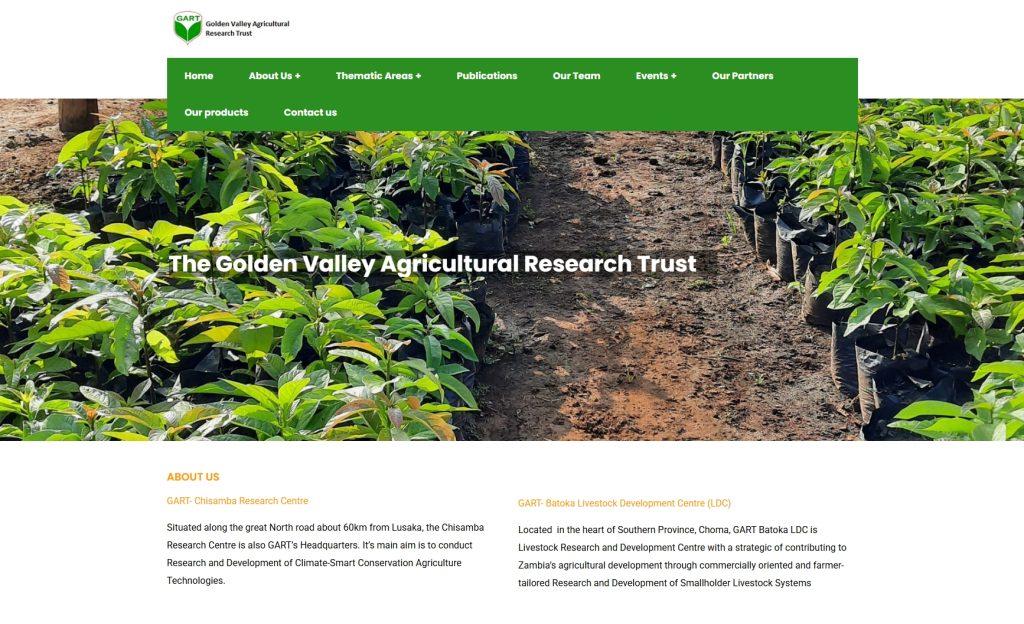 Golden Valley Agricultural Research Trust (GART) is a public-private sector partnership research institution, established in 1998 under the Land (Perpetual Succession) Act (CAP 288) of the Laws of Zambia. GART envisions becoming a centre of excellence in research and development for climate-smart agriculture in Zambia and beyond. Its strategic goal is to contribute to agricultural development through commercially oriented and farmer-focused research. GART conducts applied and adaptive research in climate-smart and sustainable agricultural systems, including agroforestry, conservation and regenerative agriculture, horticulture, orphaned and underutilised crops, smallholder livestock, and aquaculture. The institution also carries out contract research for companies and organisations, disseminates results through various technology dissemination platforms, and operates a commercial production unit to support income generation and institutional sustainability.
